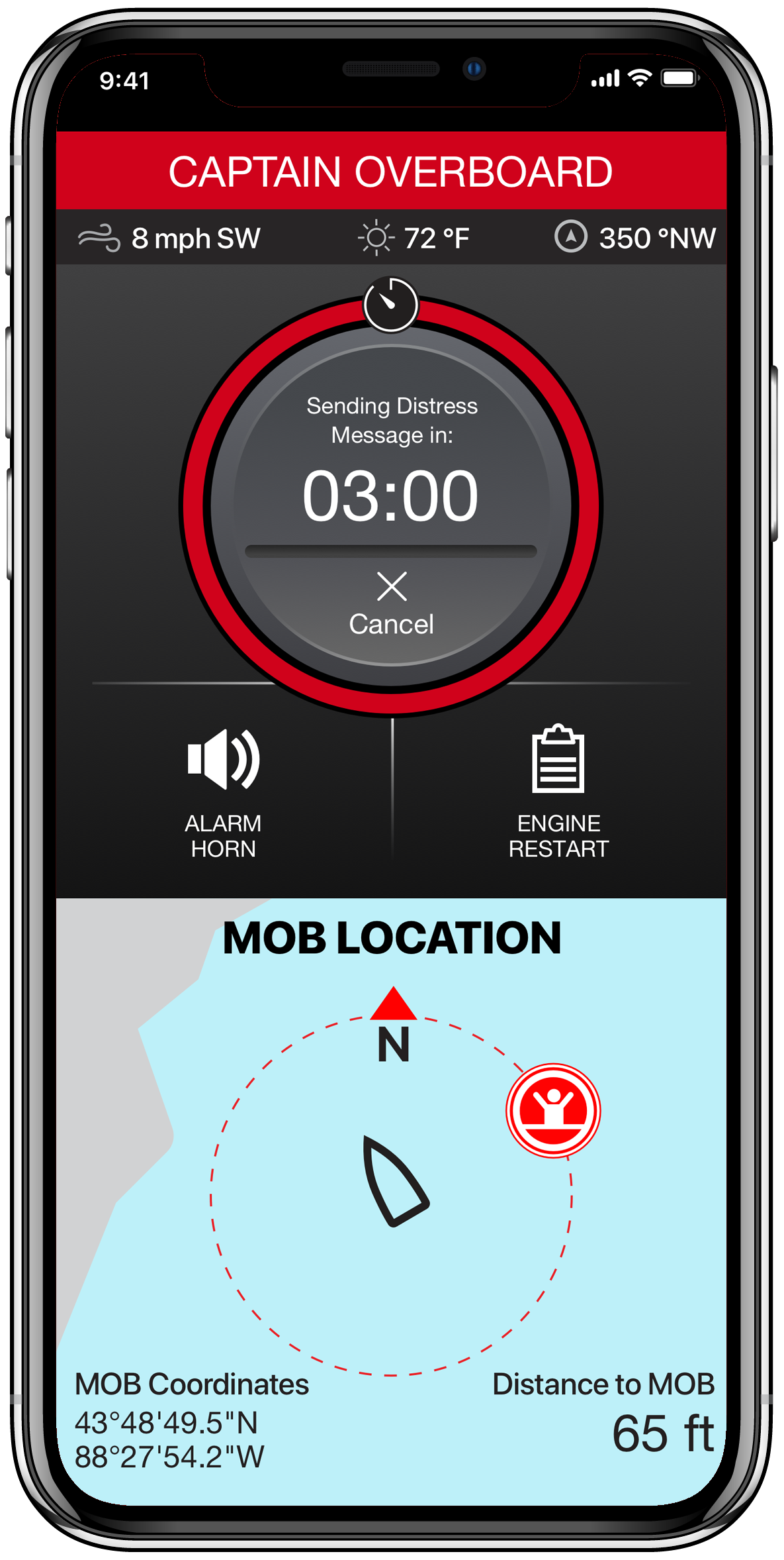 Såfremt kaptajnen, der bærer et tilkoblet vedhæng falder overbord lyder et højt signal fra 1st Mate kontrolboksen samt på mobil app ´en. Motorerne stopper og passagerer ombord modtager instruks om hvordan de kan vende båden og hente kaptajnen op af vandet. Sejler kaptajnen alene, udsendes en nødbesked til personer i mobilens nødkontakter med information om GPS koordinater, sted og tid.